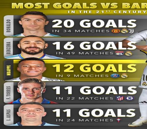 本世纪对阵巴萨进球榜:C罗20球居首,姆巴佩12球第三