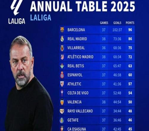西甲2025年积分榜:巴萨96分第1,皇马86分第2,马竞72分第4