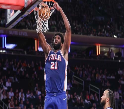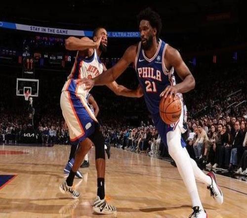 牛,恩比德在76人队大胜尼克斯队的比赛中完成了本赛季的首次扣篮