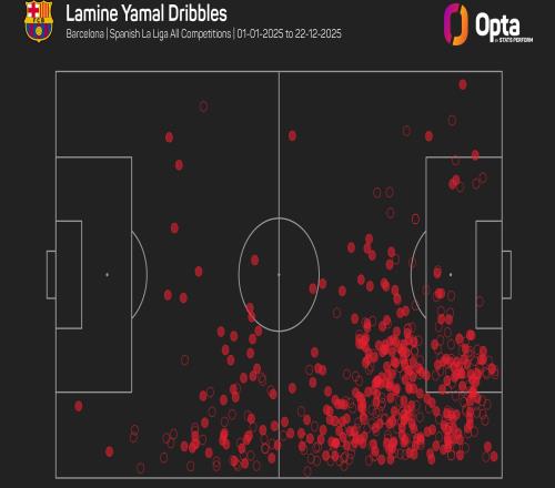 亚马尔2025年完成285次过人,位居欧洲五大联赛所有球员之首