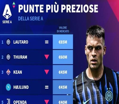 德转列意甲中锋身价前10:劳塔罗8500万第1,霍伊伦4500万第3