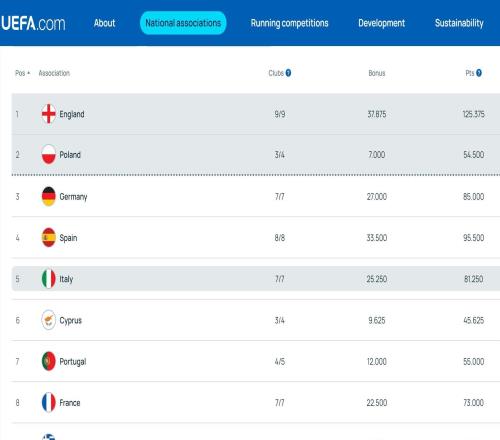 欧战系数平均积分:英超13.93分暂列第一,德甲第三西甲第四