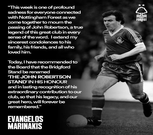 为纪念俱乐部传奇,森林老板已提议用罗伯逊名字命名看台