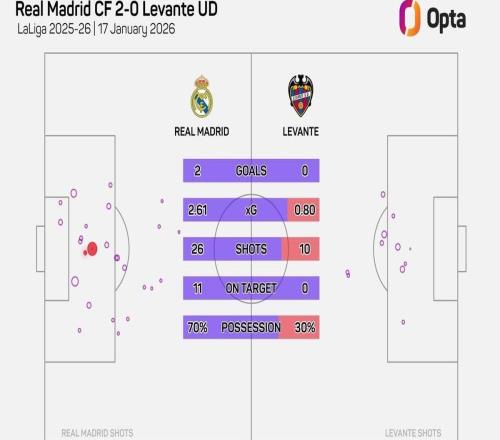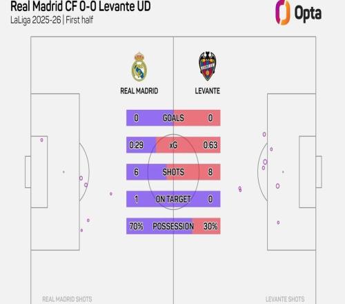 皇马对阵莱万特上半时仅6次射门,近8年球队主帅西甲首秀最少