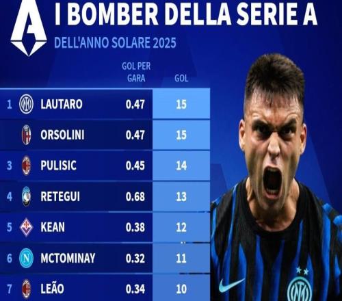 意甲2025年射手榜:劳塔罗15球并列第1,普利希奇14球第2