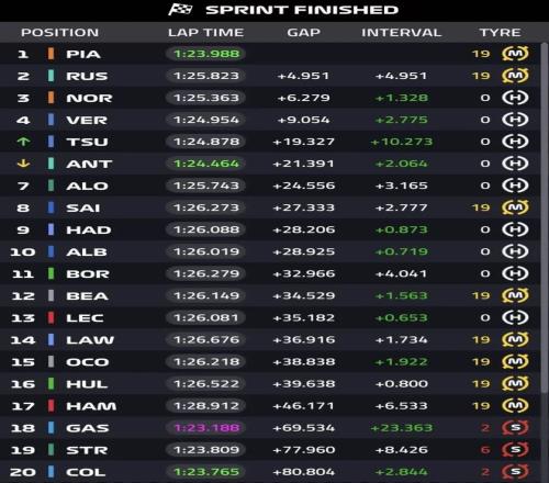 最终,皮亚斯特里pole to win获得冠军,拉塞尔第二,诺里斯第三完赛,维斯塔潘第四,但从比赛的表现来看,这个分站红牛很难对麦克拉伦发起冲击,反倒是皮亚斯特里和诺里斯的争夺越发激烈。安东内利最后时刻也被罚时5秒,把第5的位置还给了角田。