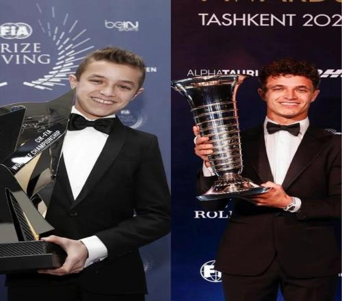 这并不是诺里斯第一次在FIA颁奖典礼捧杯,上一次他的身份是卡丁车车手,而给他颁奖的则是老汉...
