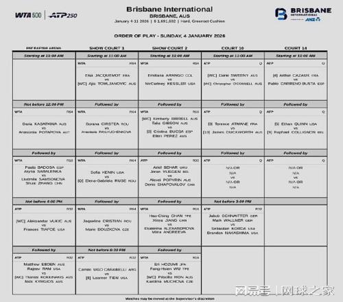 2026开年赛事之一的澳大利亚布里斯班网球公开赛(ATP250/WTA500)在北京时间今天上午开打。男子方面:本土球员武基奇将在中午时分迎战美国人蒂亚福;阿根廷人卡拉比利与美国人勒纳-钱的较量将于下午4点半左右进行。