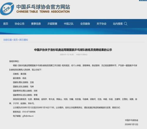 今天(1月12日),中国乒协官网发布“关于洛杉矶奥运周期国家乒乓球队教练员竞聘结果的公示”: