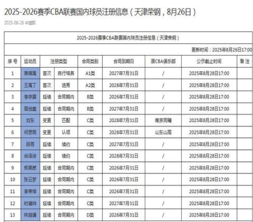 雷速体育8月26日讯 CBA官方更新了天津男篮13人注册名单,林庭谦作为队内唯一的顶薪球员合同延续,新赛季加盟的刘东,何思雨完成官宣。