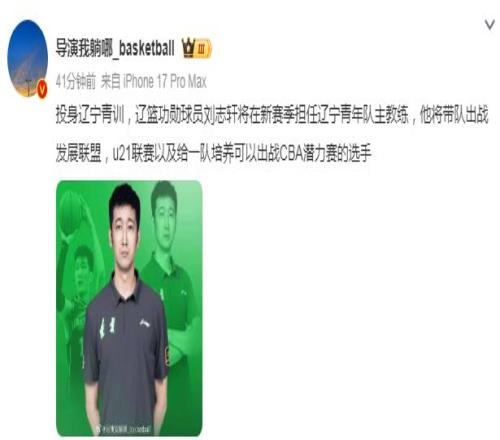 北京时间11月28日,根据媒体人导演我躺哪_basketball报道,34岁的刘志轩新赛季将担任辽宁男篮青年队主教练,他上赛季是辽宁男篮的助教,球员时代曾经跟随球队夺得两冠。