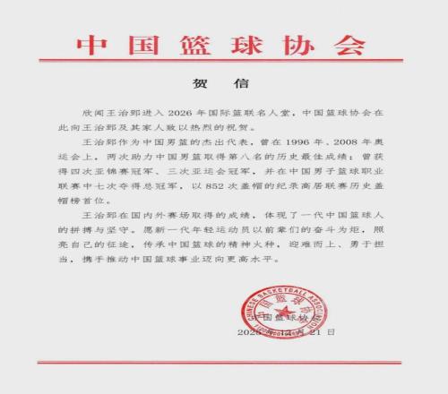 同日,中国篮协发贺信,祝贺王治郅入选2026年国际篮联名人堂。