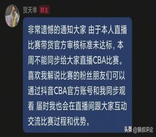 贺天举表示,自己因为直播比赛带货未达到标准,本周不能同步直播CBA比赛。除了CBA官方直播间外,还有很多博主、前球员等也能进行有画面的直播。