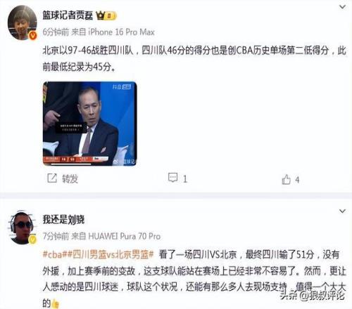 媒体人“刘骁”发文点评:“看了一场四川VS北京,最终四川输了51分,没有外援,加上赛季前的变故,这支球队能站在赛场上已经非常不容易了。然而,更让人感动的是四川球迷,球队这个状况,还能有那么多人去现场支持,值得一个大大的点赞”。