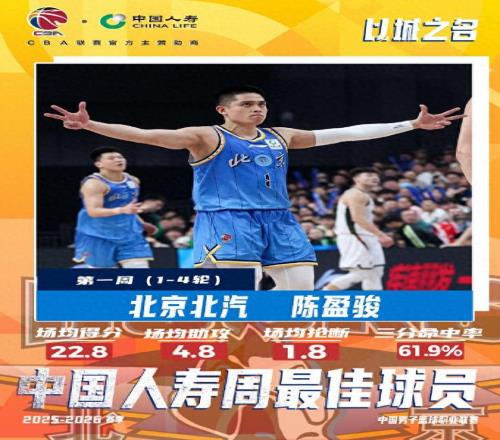 CBA官宣,陈盈骏当选2025-2026赛季CBA联赛常规赛第一周周最佳球员。