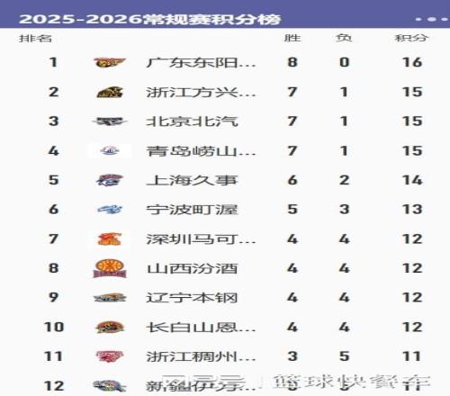 CBA常规赛第8轮全部战罢,广东、北京、广厦等队悉数出战。11冠王广东队这一战大胜天津队,成功豪取8连胜,凭借着8胜0负的战绩,直接冲上积分榜榜首的位置。而北京队在输给卫冕冠军广厦后,他们的排名已经下滑到积分榜第3,广厦在击败北京队后,他们则重返积分榜第2。山西队在爆冷输给山东队以后,他们的排名也下滑到积分榜第8,另外四冠王辽宁队已经跌出前八了。