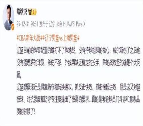 著名辽宁媒体人哈秋老师则表示:辽篮目前的阵容配置的确打不了阵地战,没有持球组织的核心,威尔斯伤了之后也没有能硬解的球员,杀伤不够、外线再缺乏稳定的投手,阵地战攻坚的确是个大问题。辽篮想赢球还是得靠防守和转换进攻,抓反击快攻、抓衔接段进攻,但是这又对篮板球、对抗强度和防守专注度提出了极高的要求…真的是考验球员们斗志和意志品质的时候了!
