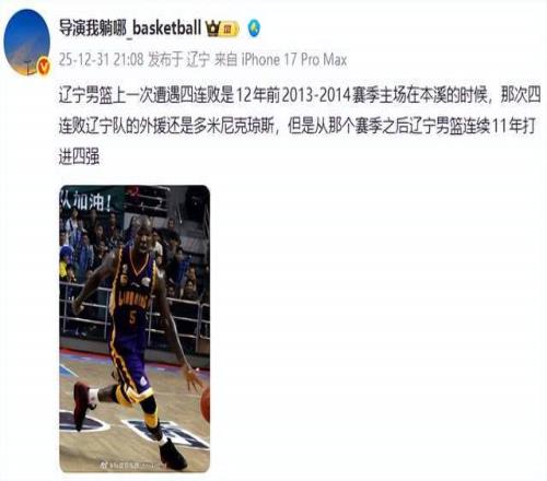 另一位辽宁媒体人导演我躺哪则表示:辽宁男篮上一次遭遇四连败是12年前2013-2014赛季主场在本溪的时候,那次四连败辽宁队的外援还是多米尼克琼斯,但是从那个赛季之后辽宁男篮连续11年打进四强
