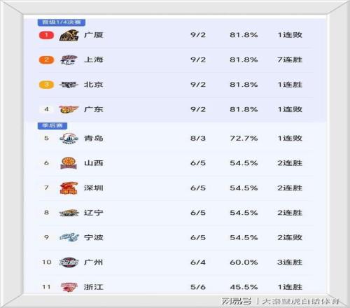①、排名前4的广厦、上海、北京队和广东队战绩都是9胜2负,最“吃亏”的是广东队,上一轮遭到争议判罚被绝杀,不仅痛失榜首宝座,还在4强中排名垫底;