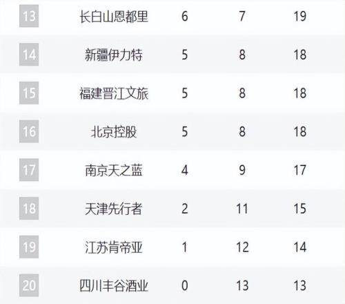 13-17分别是吉林、新疆、福建、北控、同曦。这里的新疆肯定是焦点了,在换帅之后,这轮大胜江苏,不知道后续能不能崛起。至于吉林和北控都输球了,但北控张庆鹏还不下课的话,他们的困境还是非常大。同曦还是球队的实力配置太差,现在四连败了。福建则击败天津,终结了三连败。