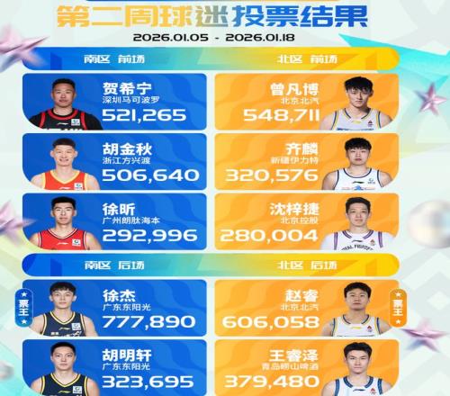 全明星赛第二周票数公布,这一周的票王还是没有改变。特别是对于徐杰来说,他不仅是南区的票王,还是全部球员中票数最多的一个球员了,甚至比北区票王赵睿还要多17万,这样的优势非常大了。当然最近徐杰的状态确实糟糕,希望这种支持可以让徐杰的状态回暖一些吧。赵睿还在伤停阶段,如果正常的话,全明星还是可以打的。