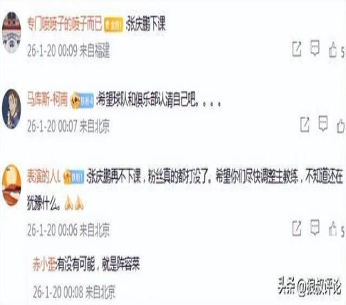 有球迷在官媒点评说道:“张庆鹏再不下课,粉丝真的都打没了。希望你们尽快调整主教练,不知道还在犹豫什么。”