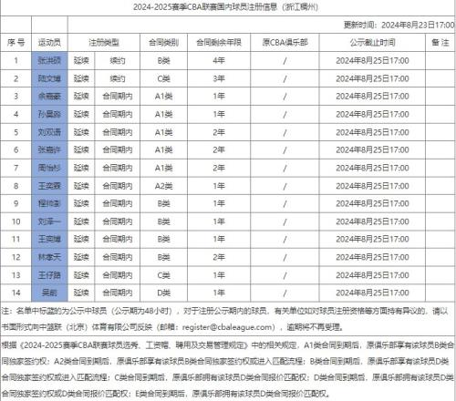 体育资讯8月23日报 今天,CBA官网公布了2024-2025赛季浙江男篮的国内球员注册信息。