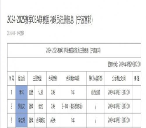 体育资讯8月29日报 今天,CBA官网更新了宁波新赛季注册名单。