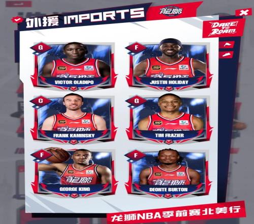 在本次NBA季前赛开始前,广州龙狮俱乐部一口气签下奥拉迪波、贾斯汀·霍勒迪、卡明斯基、蒂姆·弗雷泽、乔治·金和德恩特·伯顿等六位临时外援,在为期半个月的北美行期间,他们参与到广州龙狮的日常行程和训练当中,并随队征战即将到来的三场NBA季前赛。他们在争取留在NBA,同时广州队或者其他CBA球队也可以通过NBA季前赛考察这些球员。