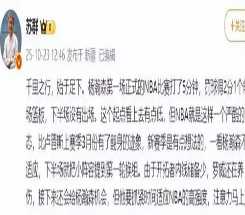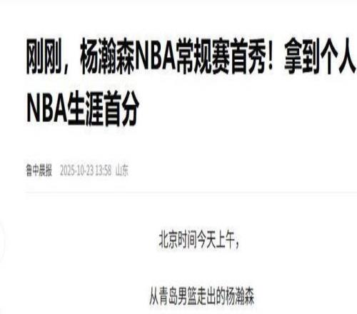 鲁中晨报:(刚刚,杨瀚森NBA常规赛首秀!拿到个人NBA生涯首分2025.10.23)