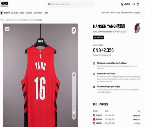 北京时间12月16日,杨瀚森在12月8日开拓者对阵灰熊的比赛中穿着的球衣在拍卖网站上成交。