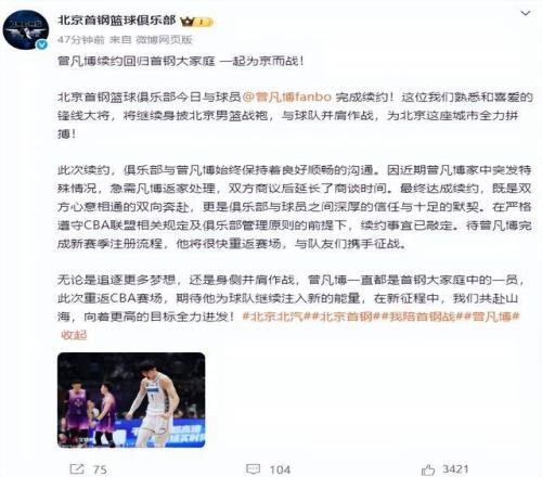 北京首钢俱乐部发文,曾凡博续约回归首钢大家庭, 一起为京而战!