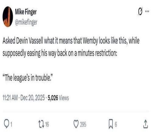面对文班亚马这样的表现,队友瓦塞尔赛后直言:“这个联盟有麻烦了!”