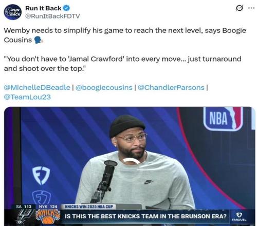 同为内线球员的考辛斯则表示文班亚马已经到了“少就是多”的阶段,他完全不必每次进攻都像克劳福德那样花哨,文班的下一个课题是简化比赛方式。