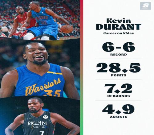 北京时间明日,一年一度的NBA圣诞大战即将打响。今日,美媒晒出了火箭球星凯文-杜兰特的圣诞大战数据。