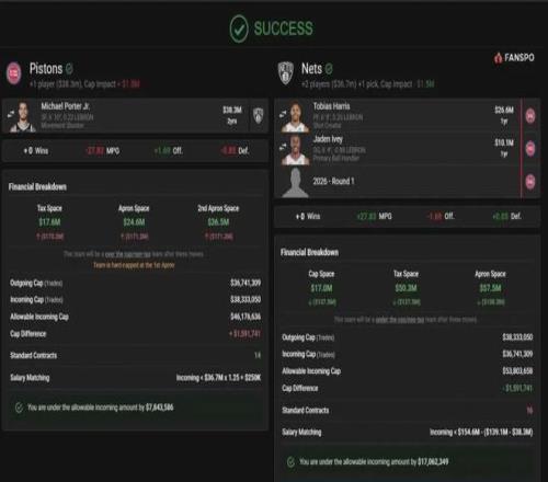 美媒建议活塞可以就小波特,向篮网报价哈里斯(2663万美元,合同年)+艾维(1011万美元,合同年)+一个选秀权,也许便能大功告成。