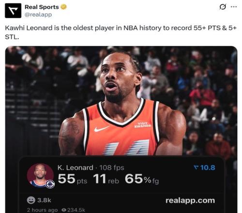 纪录二:34岁183天的小卡,成为NBA历史上单场砍下至少55分5抢断最老的球员;