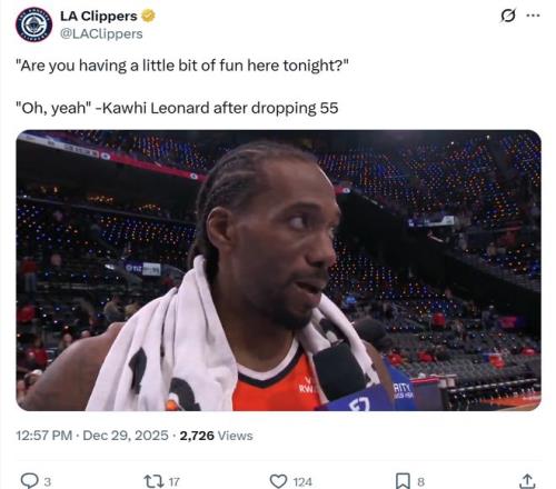 面对小卡这样的表现,快船主帅泰伦卢自然喜不自胜:“当莱昂纳德保持健康时,他就是这个联盟中最强的球员之一,我们正处于一个巨大的困境中,真的需要他这样的表现。”