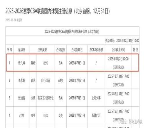 2025年的最后一天,北京首钢传来好消息。CBA官方在这一天更新了球员注册信息,曾凡博的名字终于重新出现在北京男篮的名单中。3年B类合同,到期时间写得清清楚楚,2028年7月31日。拖了近半年的续约,在年末这一天画上句号,也算给球迷们吃了一颗定心丸。