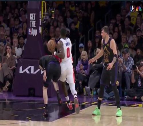 在这个回合中,活塞中锋杜伦碾着拉拉维亚强突篮下,此时在侧翼站位的东契奇并没有选择协防,只是目送杜伦攻筐,并摊开双手示意裁判杜伦进攻犯规。最终裁判未予吹罚,杜伦顺利得分。