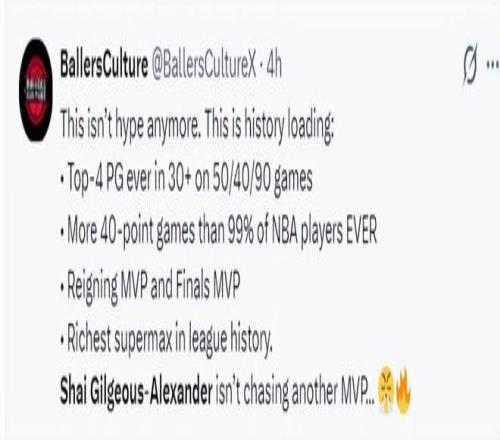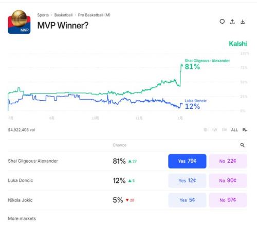 这场比赛后亚历山大的MVP概率已经提升到81%,东契奇12%,约基奇只剩下5%,随着约基奇遭遇了膝盖伤势至少停赛四周,这个MVP概率的风向就完全的导向了SGA。