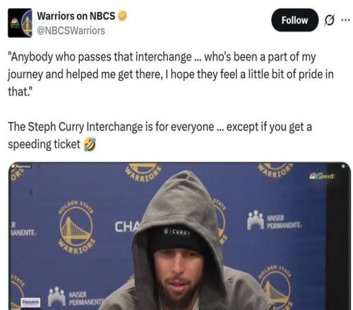 库里赛后谈及这一话题说道:“我打了一辈子球,能够通过这种方式与社区建立联系真的是意义重大,我对这份殊荣受宠若惊,也希望陪伴我旅程的每个人都能感到一丝骄傲,当然,如果你超速被罚款,别来找我。”