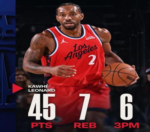 单场45分对于很多顶级得分手可能不算什么,但是对于伦纳德还是比较少见的,算上本场比赛,他职业生涯常规赛一共只拿到过11次40+,其中45+只有3次。