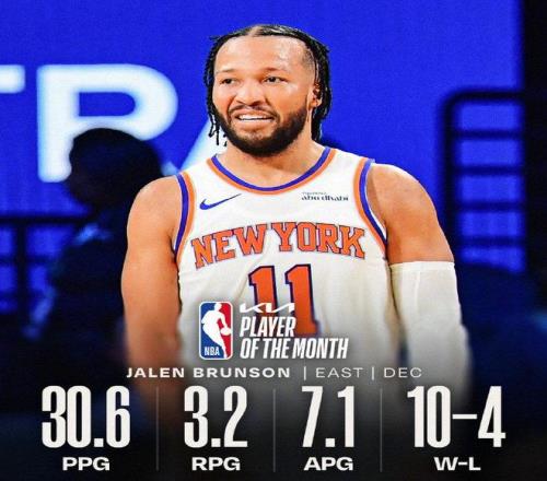 布伦森在12月场均贡献30.6分3.2篮板7.1助攻,三分命中率高达40.5%,率领尼克斯在12月收获10胜4负并夺得NBA杯冠军,至此结束球队长达52年的冠军荒,而布伦森也凭借NBA杯淘汰赛阶段场均33.3分6.7助攻的现象级表现荣膺NBA杯MVP。