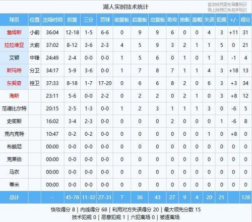 湖人:东契奇34分6板8助2断、詹姆斯31分9板6助、拉拉维亚21分9板3助2断、斯玛特13分8板7助、海斯12分2板2断、史密斯8分2助、范德比尔特5分3板1助、艾顿4分6板