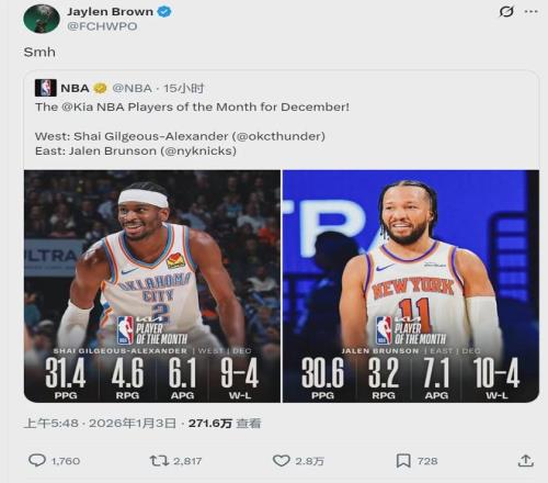 NBA官方公布12月份的月最佳球员,布伦森当选东部月最佳,亚历山大当选西部月最佳。凯尔特人球员杰伦-布朗转发这则报道,并表示不理解。此后布朗在直播中还说道:“无意冒犯亚历山大和布伦森,但他俩这月的表现都不如我。”