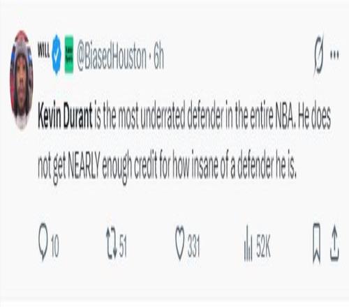 休媒:杜兰特整个生涯都是最被低估的防守球员。他作为防守球员的出色表现远未得到应有的认可。
