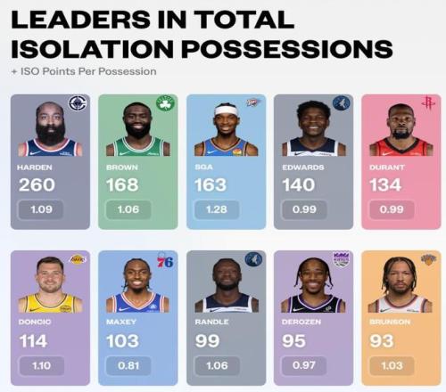 美媒Basketball University统计了本赛季截止目前NBA的单打次数及单打效率榜,哈登以260回合断崖式领先,亚历山大则是每回合得分最多的球员。