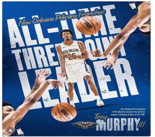 25岁的墨菲在生涯第5个赛季,已经超越麦科勒姆加冕队史三分王,只要他不被交易,他未来依然有望继续提升队史三分纪录。