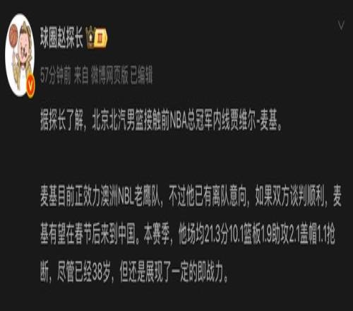 38岁的麦基目前正效力澳洲NBL老鹰队,本赛季,他场均21.3分10.1篮板1.9助攻2.1盖帽1.1抢断,竞技状态上佳,首秀就砍下32分13篮板4盖帽,但目前麦基已有离队意向,如果和北京男篮谈判顺利,麦基有望在春节后来到中国。